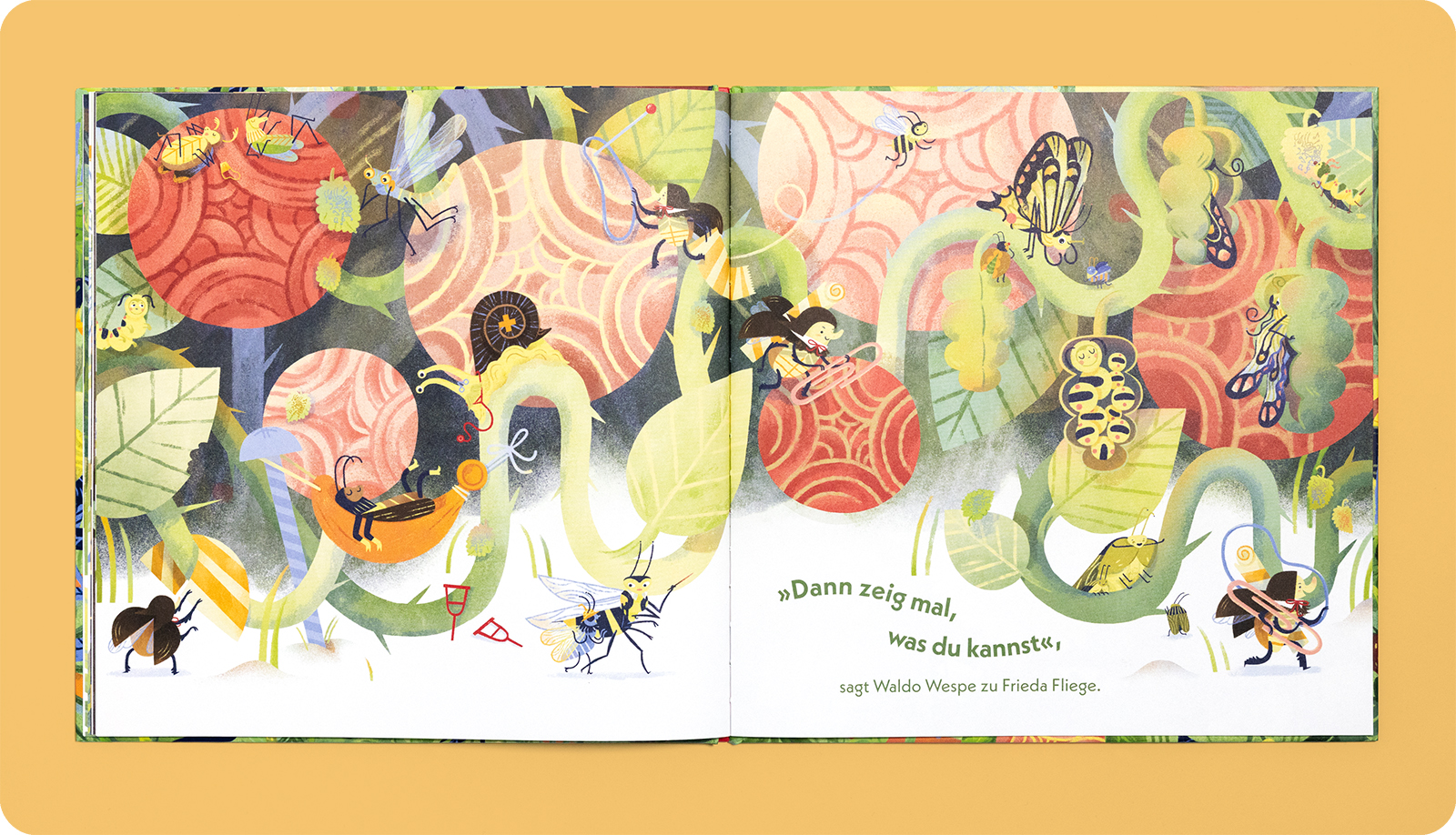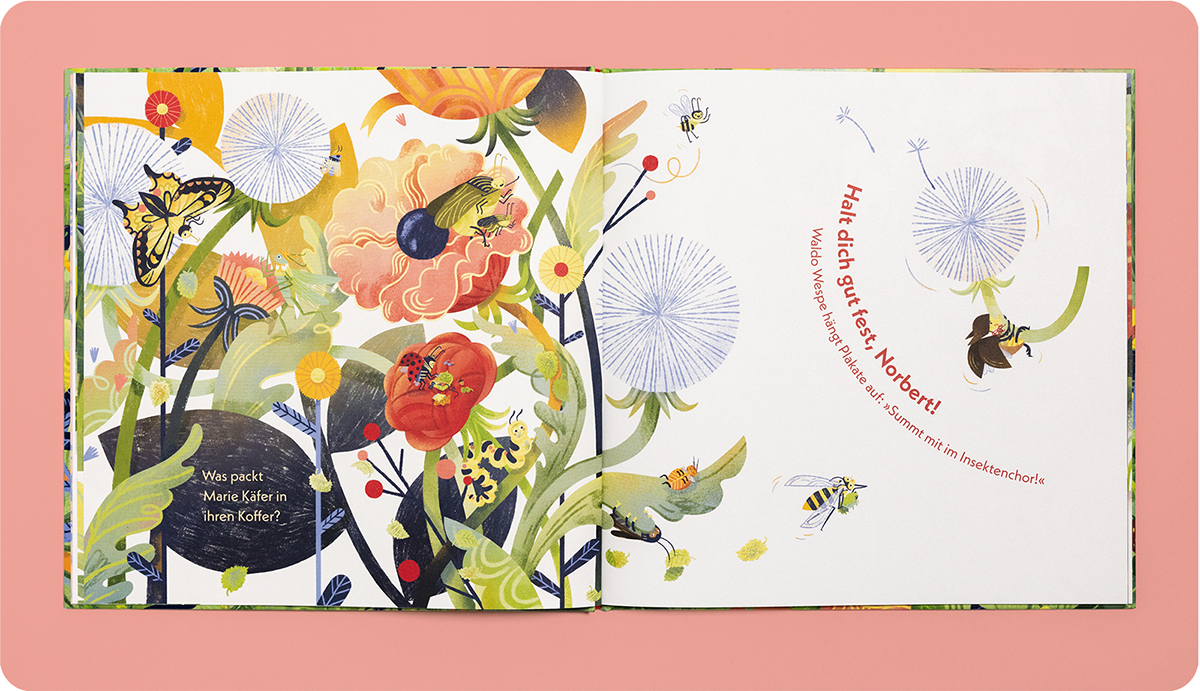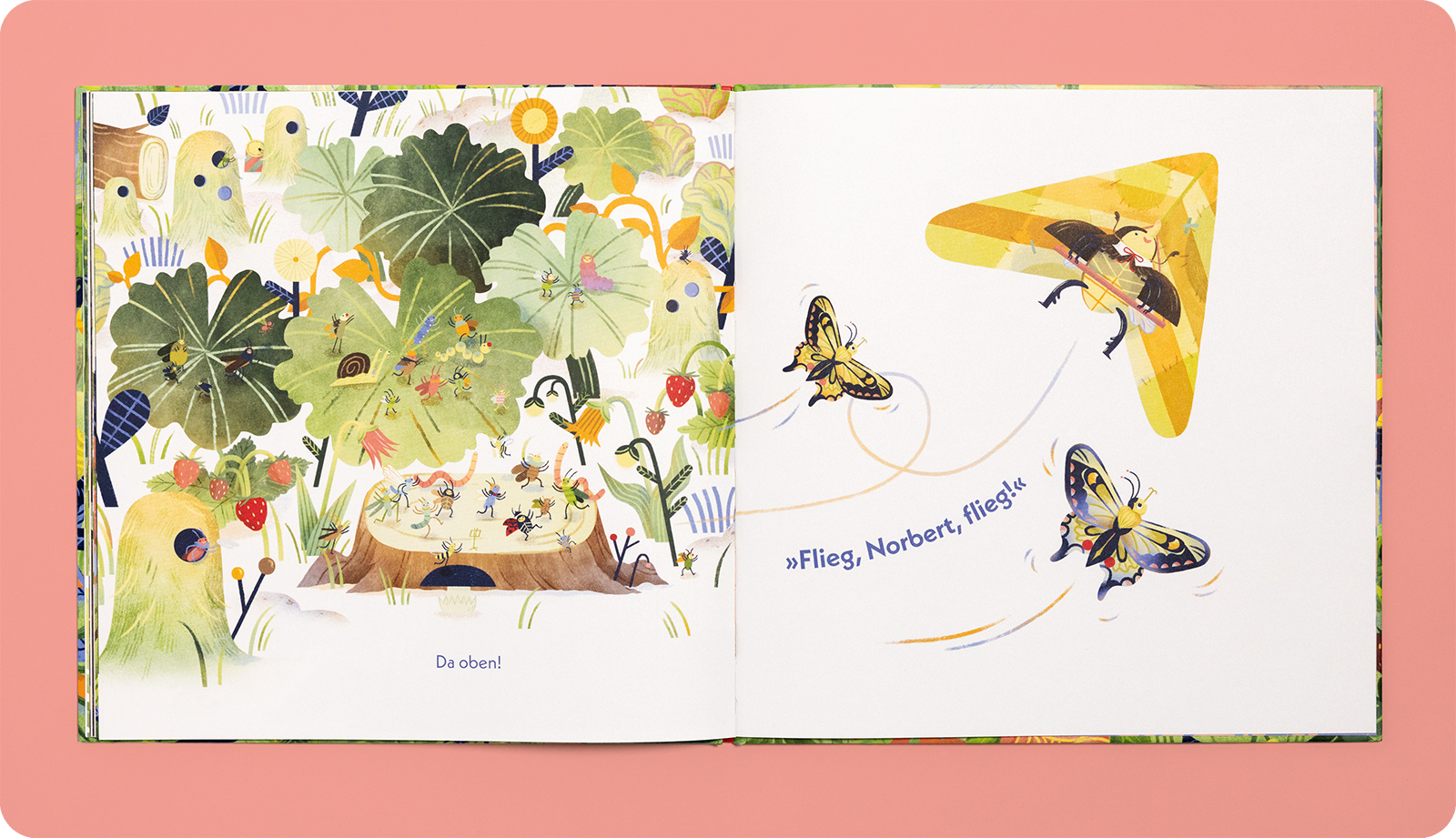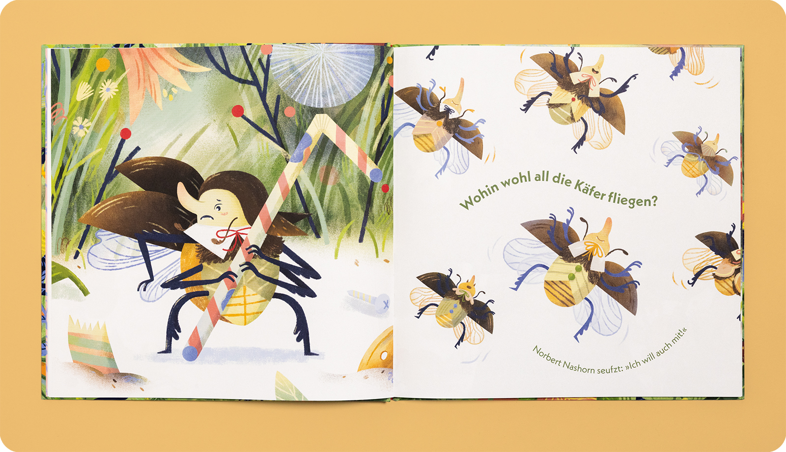 How do insects actually live? In »Krabbelstadt« (Crawling City), the garden metropolis, a wide variety of crawling beetles live together: whether it's Chantal the cockroach, Silas the butterfly, Hugo the bumblebee, or Lisa the dragonfly, they all explore nature together and experience adventures both big and small. Each double page explores a new corner of the garden city, from the compost heap to the meadow, from the insect kiosk to the large rhubarb concert hall. Follow Norbert the Rhinoceros, who learns to fly with the help of his friends, and count the bugs and beetles on his way.